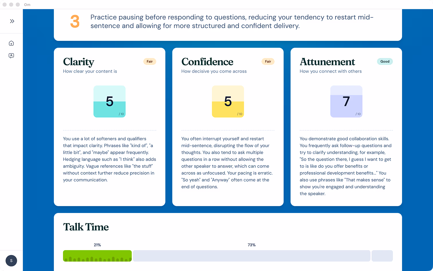 See scores for Clarity, Confidence, and Collaboration—plus 3 personalized tips to try in your next meeting.